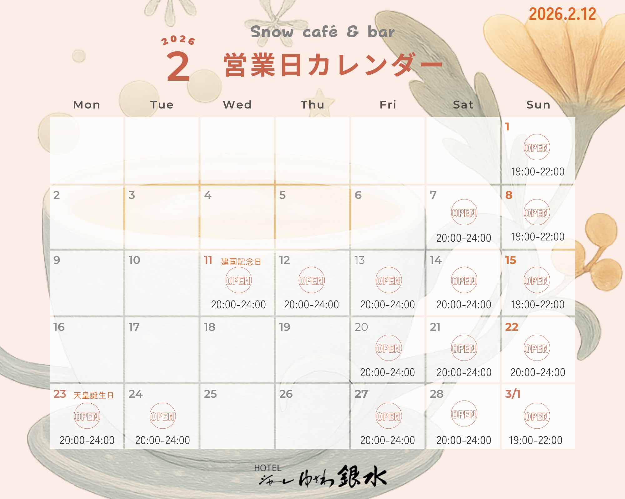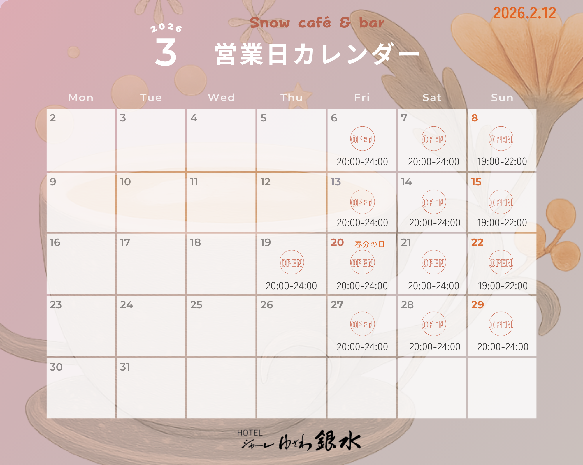 カラオケ付カフェバー「「Snow Café & Bar」2月・3月の営業時間のご案内です。